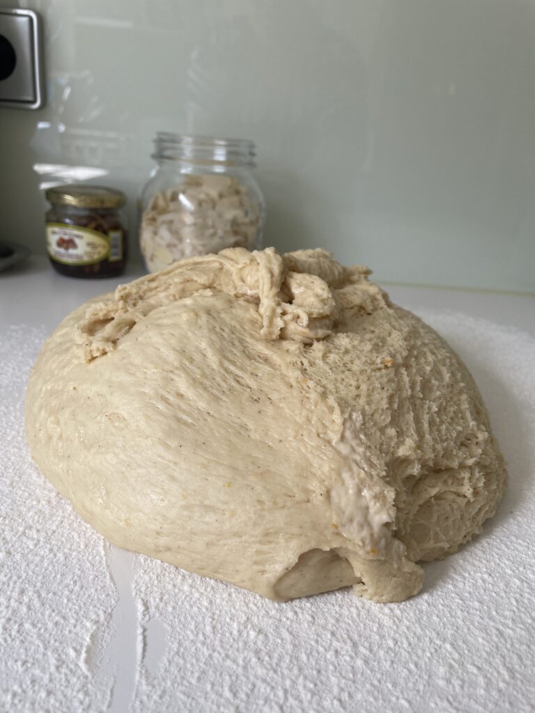 Nicht erschrecken: der Teig ist – ähnlich wie ein Briocheteig – sehr weich und klebrig. Nach der ersten Ruhezeit gibt sich das aber, und der Teig lässt sich dann mit etwas Mehl gut weiter verarbeiten.